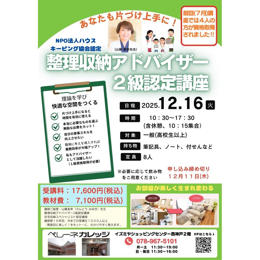 1日の受講で「整理収納アドバイザー2級」の資格が取得できます。