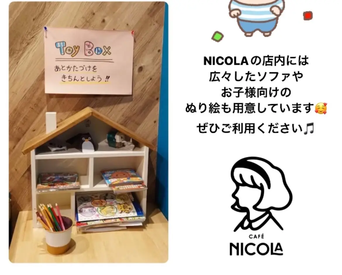 CAFE NICOLA明石店は、広々としたテーブル配置と、白を基調とした明るく清潔感のある内装が特徴でベビーカーでの来店、ママ友・お子様連れのグループ利用、小さなお子様を連れたランチ・カフェタイムなどにも安心して利用できます。
