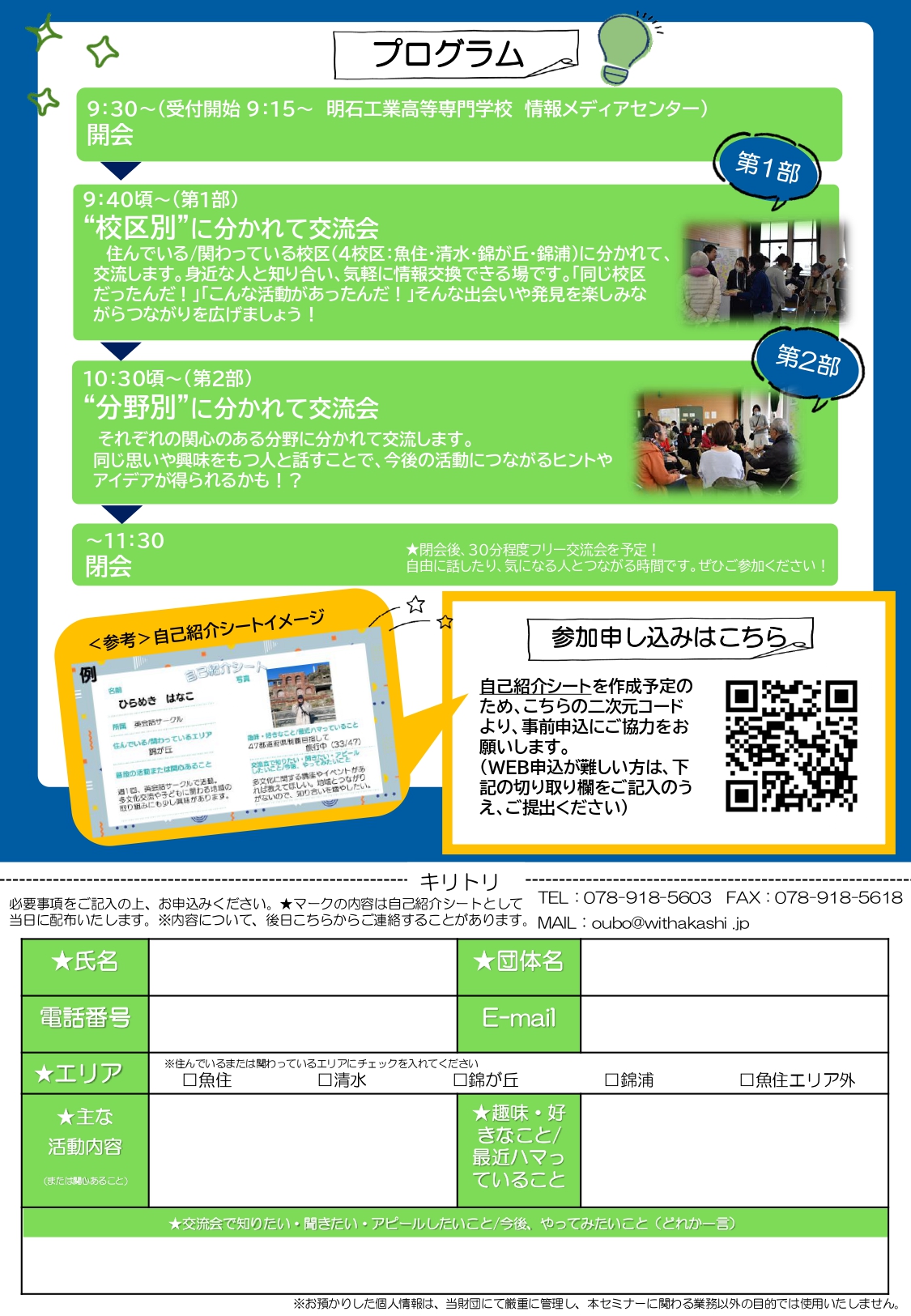 魚住地域で「活動を広げてみたい」「知ってもらいたい」「誰かとつながりたい」と思っている団体や個人の方々、参加されてみてはいかがでしょうか。