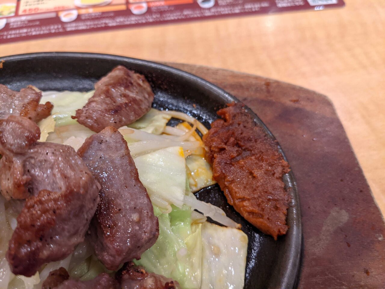 豚ハラミを使用し、辛みそを鉄板で溶かして絡めて食べて、味の変化もできるので最後まで飽きずに食べ進めることができます。